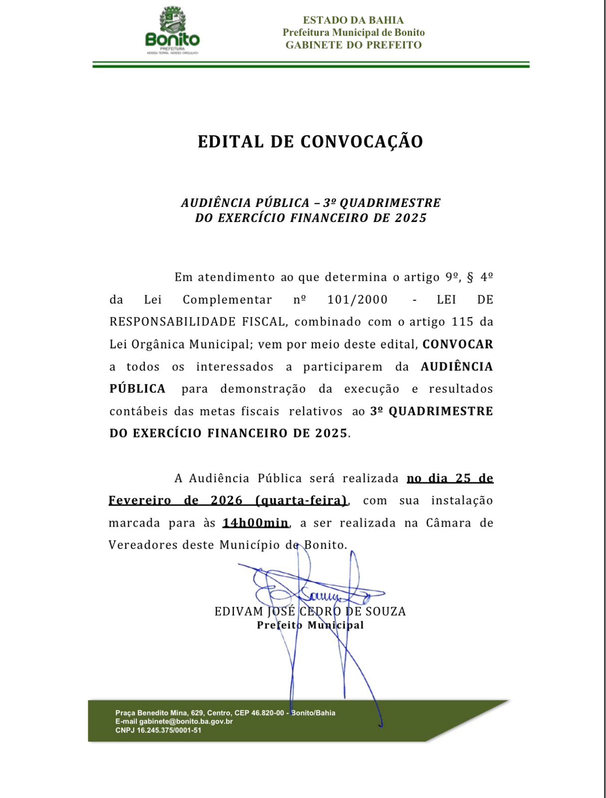 AUDIÊNCIA PÚBLICA DE PRESTAÇÃO DE CONTAS ACONTECE NESTA QUARTA, 25/02.