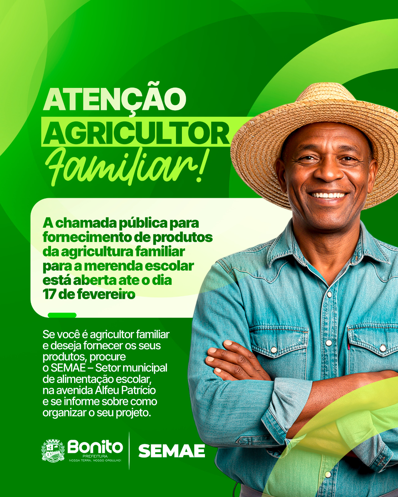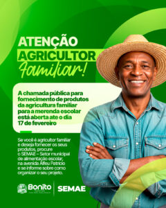 Se você é agricultor familiar e deseja fornecer os seus produtos, procure o SEMAE – Setor municipal de alimentação escolar, na avenida Alfeu Patrício e se informe sobre como organizar o seu projeto.